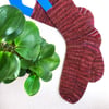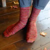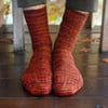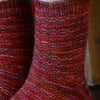 Worked in the round from the toe up with raglan toe increases and a gusset heel. Slight negative ease.