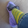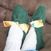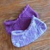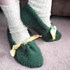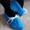 Slippers are cast on at the ankle, with short rows to shape the heel and toe, then finished with a row of eyelets for the laces a few rows before the bind off.