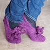 These cozy fast-finish slippers use basic stitches, short-row shaping, and a forgiving gauge for a project that will practically fly off the needles and onto your feet. A drawstring bow causes the simple shape to hug the feet, keeping them toasty while creating a very flattering fit.