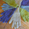 Gloves are worked from the cuff down with a thumb gusset, and the fingers are worked from the pinky finger to the index, then finished with the thumb.