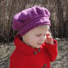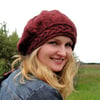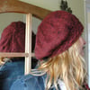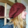 Yarn choice can make a big difference in the structure of this hat. A denser yarn will have more structure, like the purple sample, and a less dense yarn will drape better, like the burgundy sample.
