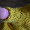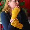 Cast on the cabled wristband with a provisional cast on, then work the wristband flat. Graft into a circle. Pick up stitches to work the hand, then finish with edging bind off for the second cable. Work the thumb last.