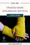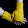 An elegant cabled border trims the top and bottom of these worsted-weight fingerless mittens. Work the cuff band flat, then pick up the hand stitches and continue in the round. Work the top band while binding off the hand stitches using the edging bind-off technique for seamless construction. Pairs wonderfully with the Twisted Rope Hat.